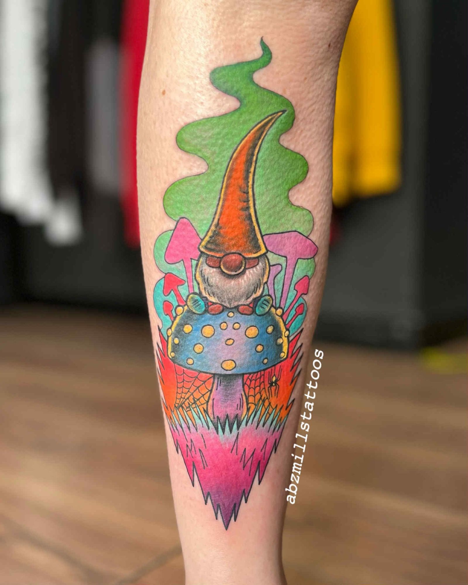 “I’m Abz — a new skool and cartoon-style tattoo artist with a love for bold lines, weird ideas, and one-off designs that make people smile (or double take). I’ve been professionally tattooing since 2011, and drawing even longer. I grew up obsessing over cartoons, sketchbooks always full, and that love for character, colour, and storytelling has shaped the way I work today.